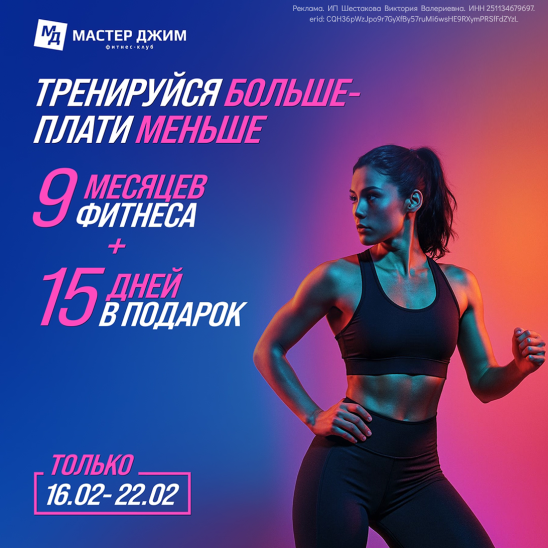 Оформите абонемент НА 9 МЕСЯЦЕВ безлимитного посещения фитнес-клуба - получите 15 ДНЕЙ БОНУСОМ.